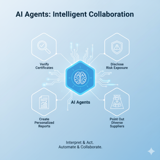 Put differently, AI agents can now verify certificates, disclose risk exposure, and create reports that are personalized. As well as it can point out new and diverse suppliers, which means AI can interpret and act.